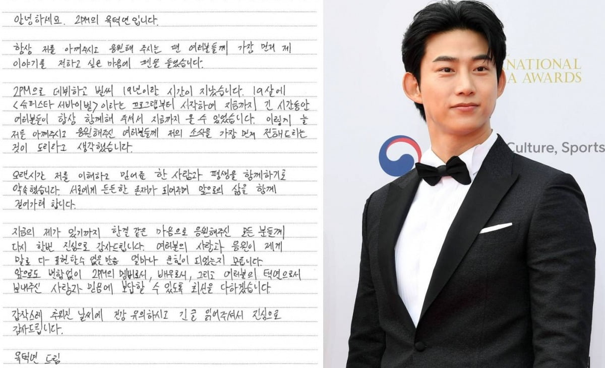 옥택연은 자필 편지를 통해 "항상 저를 아껴주시고 응원해 주시는 팬 여러분들께 가장 먼저 제 이야기를 전하고 싶은 마음에 펜을 들었다"며 결혼 소식을 전했습니다. 그는 2PM으로 데뷔한 지 19년이 지난 지금, 팬들에게 가장 먼저 소식을 전하는 것이 도리라고 생각했다고 밝혔습니다.