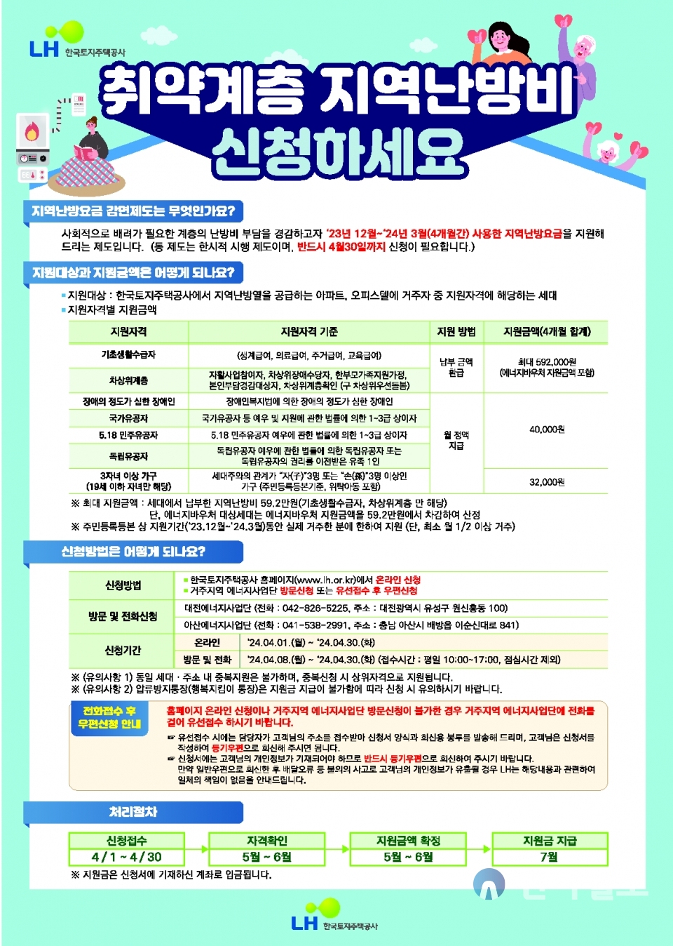 - 신청: 주민센터 방문 또는 복지로 웹사이트를 통한 온라인 신청