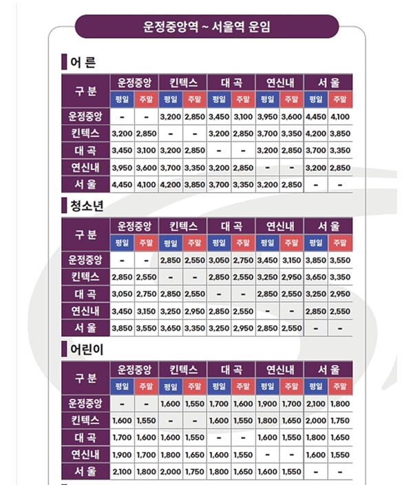 - ▶ 운정~서울역 구간: 4,450원