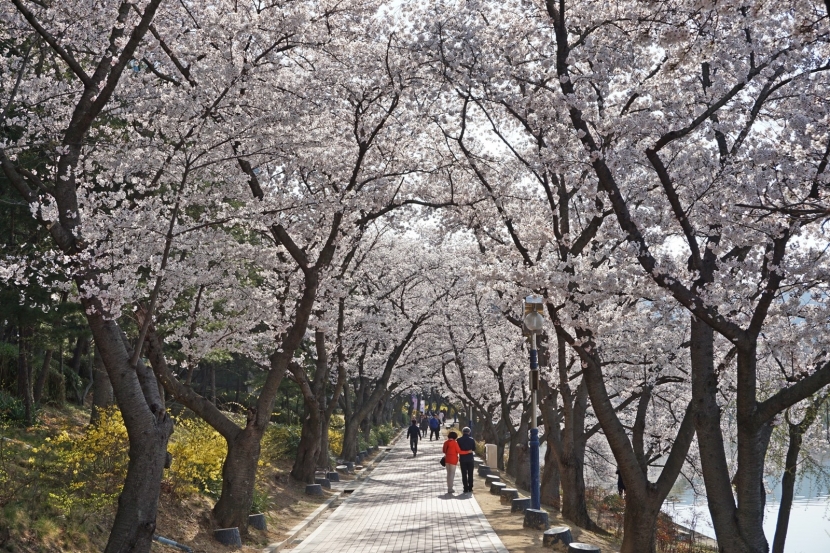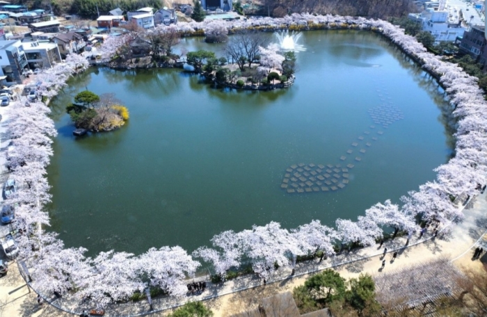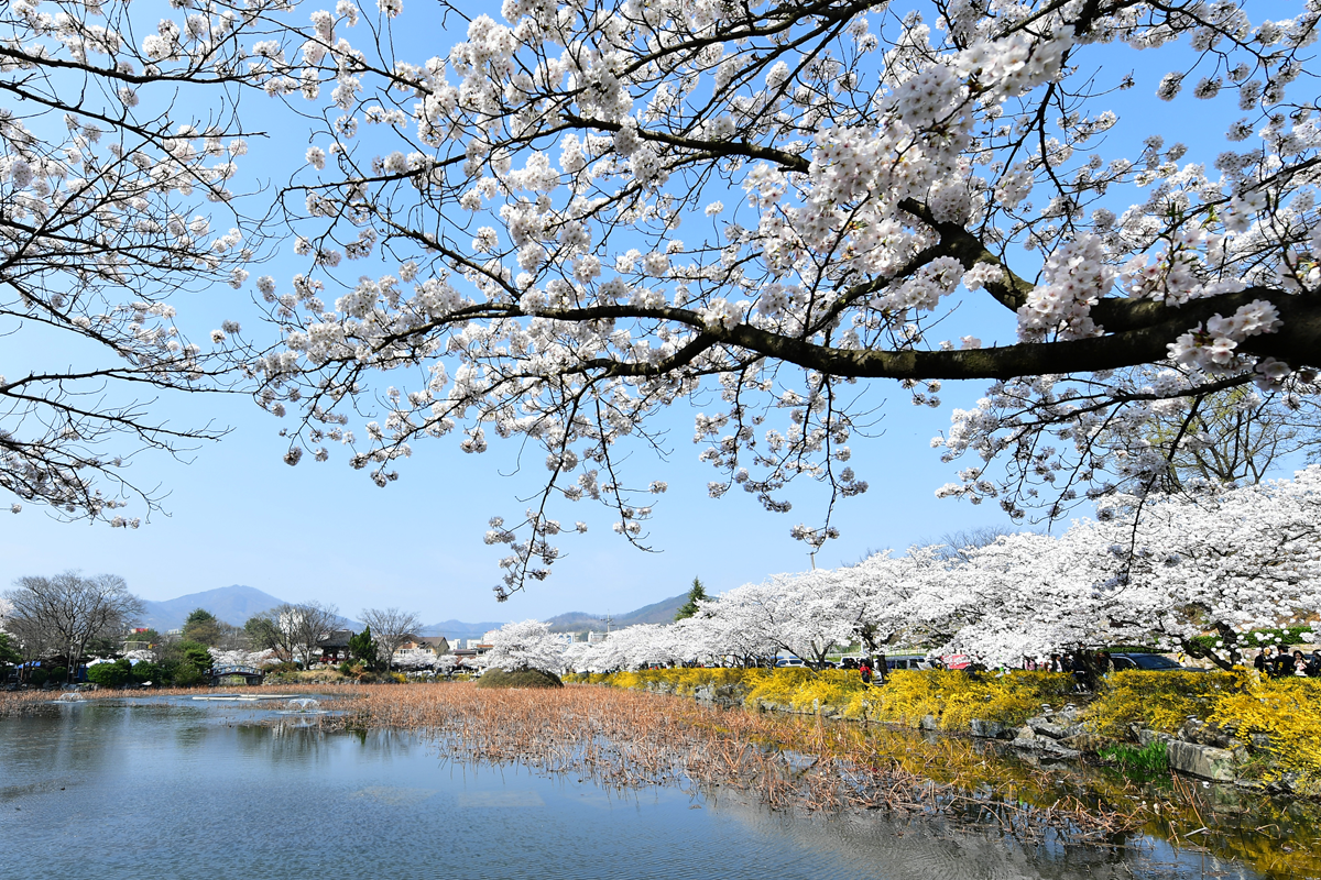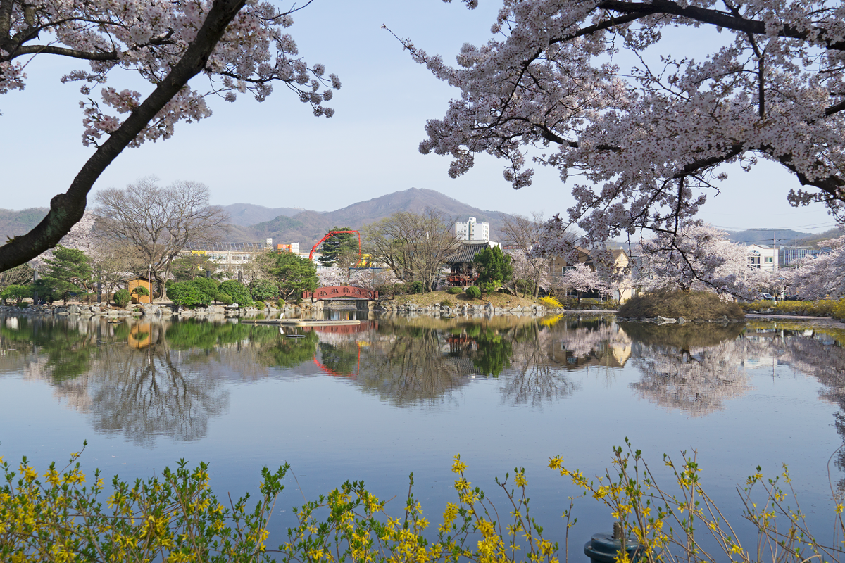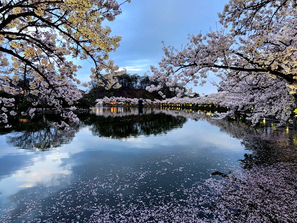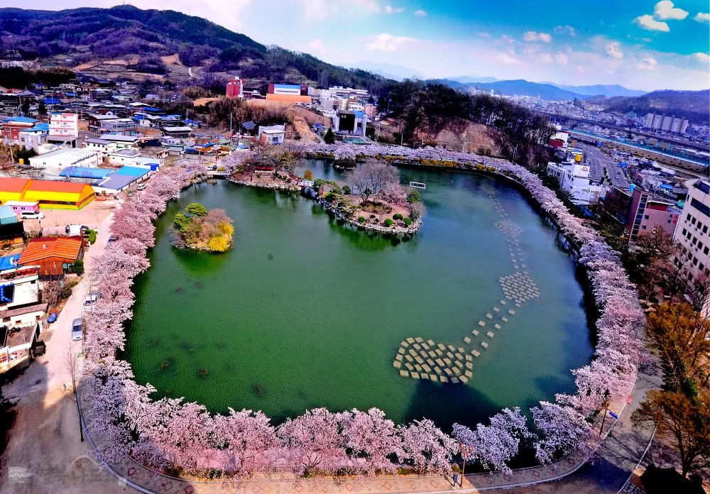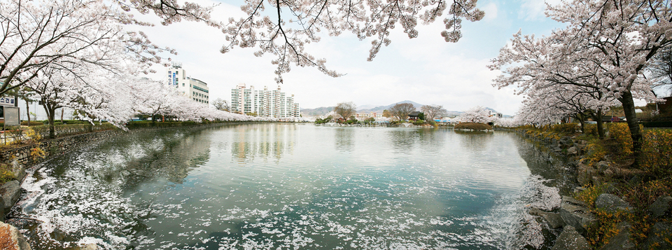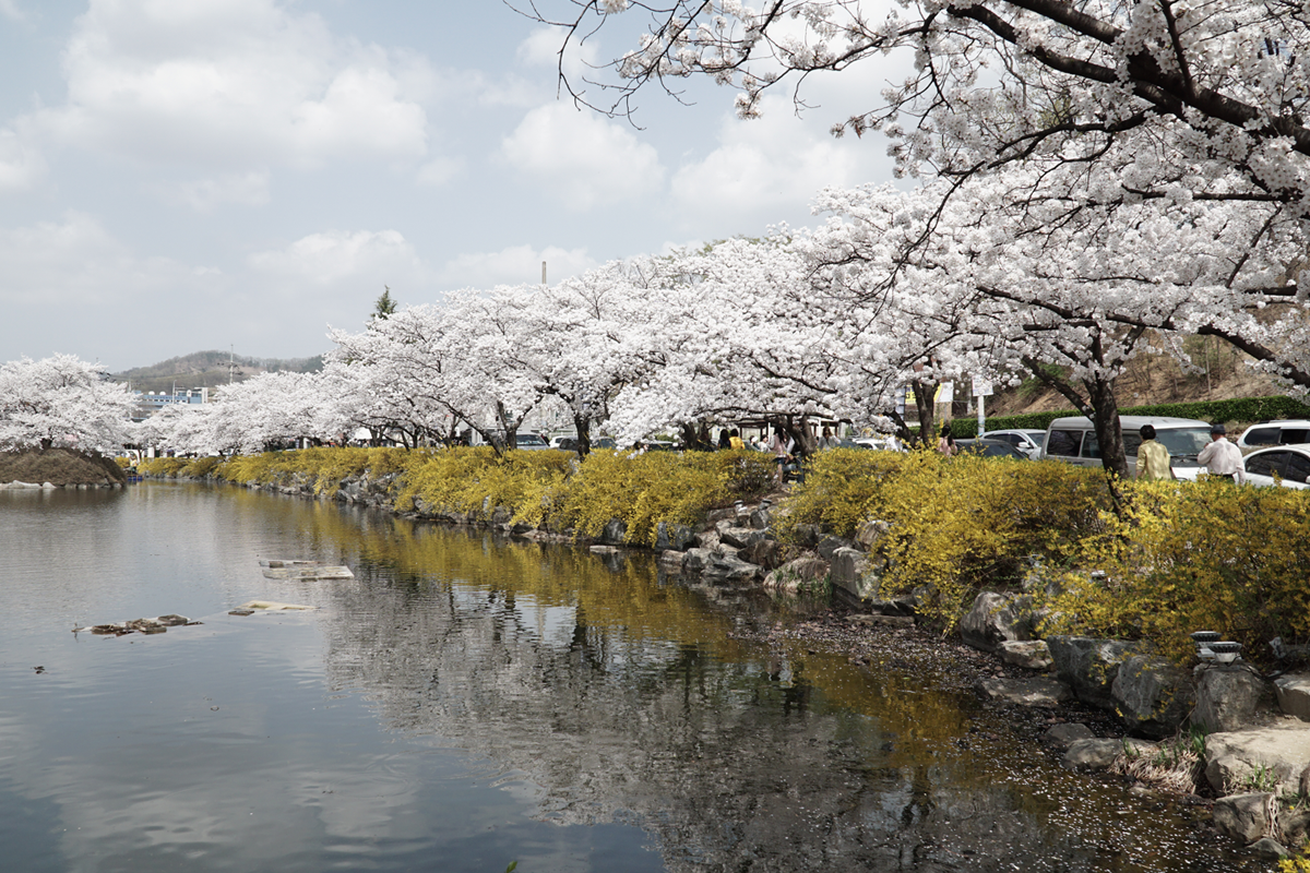 김천 연화지는 도심 속 아름다운 호수공원으로, 봄이 되면 호수를 둘러싼 벚꽃나무들이 만개하여 장관을 이룹니다. 호수에 비치는 벚꽃의 모습은 마치 한 폭의 수채화를 보는 듯한 느낌을 선사하죠. 특히 해가 저문 후에는 벚꽃과 야간 조명이 어우러져 더욱 환상적인 분위기를 자아냅니다.